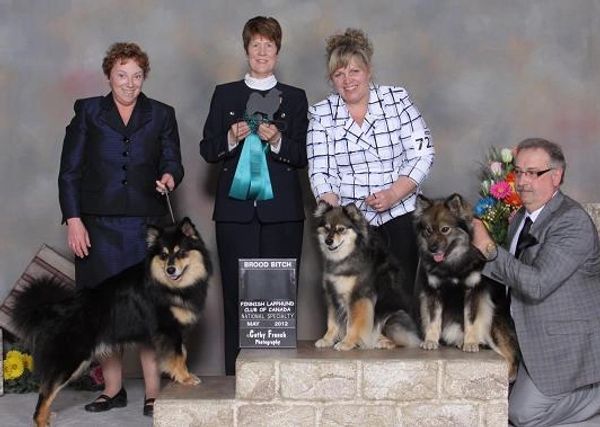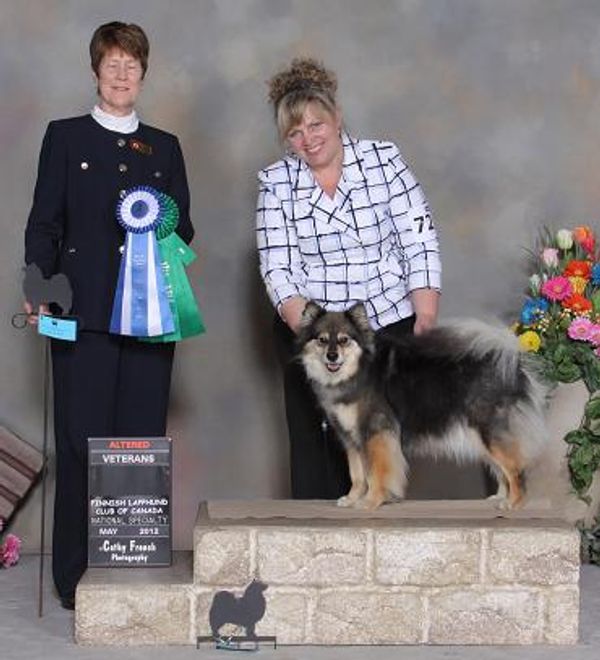 AUG 2011, FERGIE WAS THE 1ST CANADIAN BRED/OWNED FINNISH LAPPHUND TO BE A AKC CHAMPION. 2nd FLCC National Specialty was held May 19th, 2012 where she received Award of Merit. ALSO at the all breed show that weekend got 2 group placements. As Sept 2015 she is a CKC Grand Champion !!! We are very proud of all her accomplishments. She has added many beautiful pups to our gene pool.