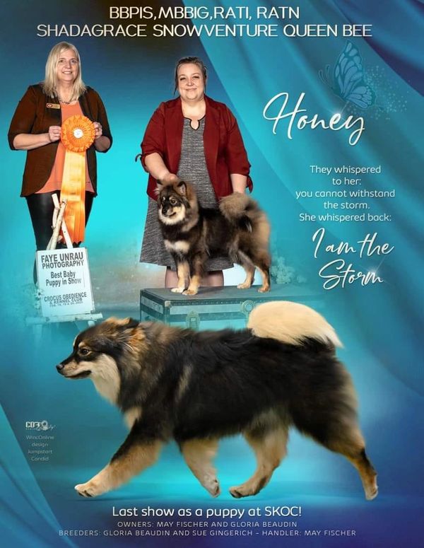Hope is a very special girl to all of us. Kendra Hutch (Nordicsol Finnish Lapphunds ) in Salt Lake City Utah approached me early 2019 about possibly using our Odin to her beautiful Tihku (Expected TihkusadeTabanyaruu). I knew this was a litter I would want a puppy from but first we had to be sure we could make puppies. We tested a few different extenders to ensure Odin's swimmers would chill and make it there viable. We were both excited they produced 6 gorgeous pups. We had a house full here so Toni and Jeffrey agreed to coown Hope. They are the most wonderful family that also owned lappie Porthos from me that was 4 years old now. Hope whelped a beautiful litter of 5 Sept 2024 and plan to carry on the Odin/Fergie/Gracie line a couple of this kids.